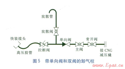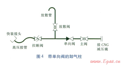 在卸氣柱卸氣過程中,由于工作人員的疏忽,在更換第二輛CNG氣瓶車時,誤操作將第一輛和第二輛CNG氣瓶車所連接的卸氣柱主閥同時打開。這時就會造成第二輛車內(nèi)的CNG反充入第一輛車(尤其是CNG減壓橇流量不大的時候),使得第一輛車內(nèi)的余氣量增加,影響正常運(yùn)營。為了防止工作人員誤操作所帶來的問題,可以在卸氣柱主閥的前面增加一個單向閥。帶單向閥的卸氣柱見圖4。