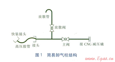 簡易卸氣柱由連接CNG氣瓶車的快裝接頭、高壓膠管、主閥、放散閥、連接管道組成。簡易卸氣柱結(jié)構(gòu)見圖l。