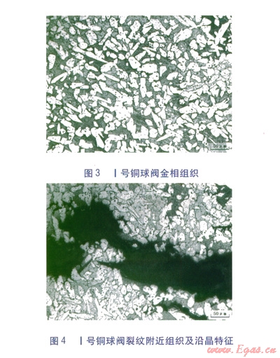 對I號、Ⅱ號銅球閥的金相組織[1]及裂紋進行分析,結(jié)果如下: