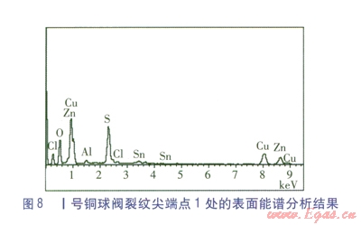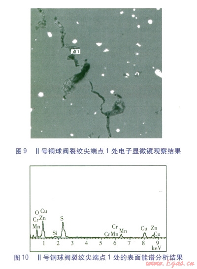 對Ⅱ號銅球閥裂口尖端處的灰色物質(zhì)試樣進行掃描電子顯微鏡觀察,結(jié)果表明:裂紋表面可見明顯灰色覆蓋物。能譜分析結(jié)果表明主要成分為Cu、Zn、S、O和少量Cr、Mn等,Ⅱ號銅球閥裂紋尖端點l處的電子顯微鏡觀察結(jié)果和表面能譜分析結(jié)果見圖9、10。