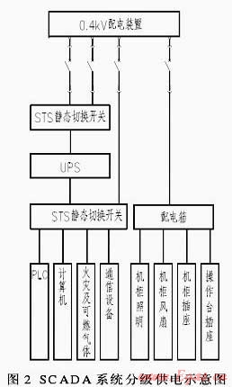 從圖1可見,SCADA系統(tǒng)正常情況下由UPS供電,在UPS設(shè)備故障時(shí)由變電所直接供電。該系統(tǒng)的設(shè)計(jì)考慮多級冗余,一是UPS進(jìn)線冗余設(shè)置,二是在線式UPS本身具有旁路功能,即正常情況下一路經(jīng)濾波整流直接輸出,故障情況下另一路由后備電池經(jīng)逆變器后輸出,三是一路變電所低壓電作為UPS的備用。以上供電系統(tǒng)多級冗余設(shè)計(jì)時(shí)需設(shè)置STS靜態(tài)切換開關(guān)。