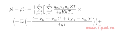將裂縫單翼均等分成竹份,每等份可以看成是一個(gè)點(diǎn)匯。利用無(wú)限大均勻地層點(diǎn)匯定流量的壓降公式,可以求出該點(diǎn)匯對(duì)地層中任意一點(diǎn)產(chǎn)生的壓降[8-10];將地層任意一點(diǎn)替換為裂縫尖端,就可以得到所有點(diǎn)匯同時(shí)生產(chǎn)時(shí)對(duì)裂縫尖端產(chǎn)生的壓降;考慮到裂縫半長(zhǎng)遠(yuǎn)大于水平井筒半徑,裂縫內(nèi)流體從裂縫邊緣向井筒周?chē)奂?,?span lang="EN-US">i條裂縫可以看成是流動(dòng)直徑為裂縫長(zhǎng)度、地層厚度為裂縫寬度、邊界壓力為裂縫尖端壓力、井底流壓為水平井井筒內(nèi)壓力的微型平面徑向流油藏;根據(jù)壓力連續(xù)和流量守恒方程,就能得到考慮裂縫干擾的壓裂水平井油井產(chǎn)量預(yù)測(cè)模型[2,5];進(jìn)一步根據(jù)壓力函數(shù)的定義和真實(shí)氣體狀態(tài)方程,并將地層條件下的產(chǎn)量換算為地面標(biāo)準(zhǔn)情況下氣體產(chǎn)量,就可以得到氣藏壓裂水平井產(chǎn)量預(yù)測(cè)模型:
