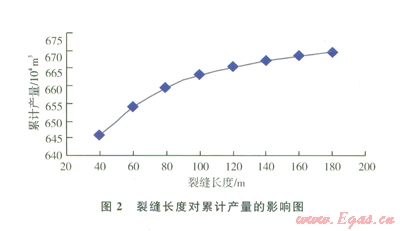 圖2是不同裂縫半長(zhǎng)生產(chǎn)1年的累計(jì)產(chǎn)量結(jié)果??梢钥闯?,隨著裂縫長(zhǎng)度增加,累計(jì)產(chǎn)量逐漸增大,隨著裂縫長(zhǎng)度進(jìn)一步增加,增幅變小。這是因?yàn)榱芽p長(zhǎng)短反映了儲(chǔ)層的供氣面積大小。當(dāng)裂縫長(zhǎng)度增加到一定程度后,縫長(zhǎng)越大,氣體在裂縫中流動(dòng)時(shí)的摩阻越高,反而會(huì)影響產(chǎn)量。在本算例中,最佳裂縫半長(zhǎng)為60~80 m。