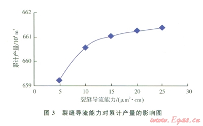 圖3是累計(jì)產(chǎn)量與裂縫導(dǎo)流能力的關(guān)系曲線(xiàn)。可以看出,存在累計(jì)產(chǎn)量與裂縫長(zhǎng)度相似的變化規(guī)律。隨著導(dǎo)流能力增加,累計(jì)產(chǎn)量先逐漸增大后趨于平穩(wěn)。要充分發(fā)揮致密氣藏壓裂水平井的潛能,就要使裂縫導(dǎo)流能力與地層滲透率相匹配。本算例中,推薦最佳裂縫導(dǎo)流能力為10~15μm2·cm。