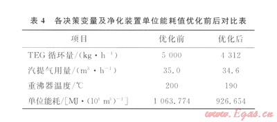 綜上可知,在優(yōu)化后的操作參數(shù)下運(yùn)行,凈化裝置單位能耗值比優(yōu)化前平均降低了l2.23%,TEG循環(huán)量比優(yōu)化前有明顯的降低,從而降低吸收劑的循環(huán)量和再生塔的能耗。汽提氣的用量基本保持不變,同時(shí),再生器重沸器的溫度明顯降低。再生器重沸器的溫度降低會(huì)減少熱量需求。