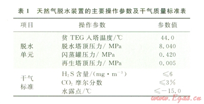 目前,國(guó)內(nèi)天然氣脫水主要采用三甘醇(TEG)脫水法,川渝地區(qū)某天然氣凈化廠600×104 m3d天然氣脫水裝置也采用典型的TEG脫水法脫除來(lái)自脫硫單元凈化濕氣中的水分,以降低天然氣的露點(diǎn)。表l為該天然氣脫水裝置的主要操作參數(shù)及干氣標(biāo)準(zhǔn)。圖2為該天然氣脫水裝置的工藝流程圖。
