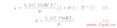 式中p為體系壓力,PaV為摩爾體積, m3T為絕對(duì)溫度,K;R為氣體常數(shù),無(wú)量綱;a、b可表示為:
