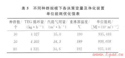 然后,分別在30、5080個(gè)種群規(guī)模下運(yùn)行優(yōu)化程序。表5所示為不同種群規(guī)模下各決策變量及凈化裝置單位能耗優(yōu)化值。