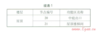 考慮到自然通風(fēng)狀態(tài)下應(yīng)避免污染,因此不將衛(wèi)生間、廚房等存在污染源的房間列入熱壓自然通風(fēng)網(wǎng)絡(luò)模型。熱壓自然通風(fēng)網(wǎng)絡(luò)模型見圖2。熱壓自然通風(fēng)網(wǎng)絡(luò)模型中各節(jié)點代表的功能區(qū)見表l。其中節(jié)點23設(shè)在通風(fēng)井底面,節(jié)點20設(shè)在屋頂表面,其他節(jié)點均設(shè)在各層高度方向的中間位置。由此可知各節(jié)點的高度差。