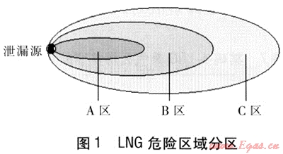 LNG蒸發(fā)達(dá)到一定濃度時(shí),可能危及人的生命安全,遇到明火,甚至?xí)a(chǎn)生爆炸。本評價(jià)根據(jù)LNG蒸氣擴(kuò)散到不同濃度時(shí)造成危害程度的大小,將LNG擴(kuò)散的危險(xiǎn)區(qū)域劃分為3個(gè)區(qū)。爆炸危險(xiǎn)區(qū)(A區(qū)):LNG蒸氣濃度高于爆炸下限,遇明火產(chǎn)生爆炸;嚴(yán)重?fù)p害區(qū)(B區(qū)):LNG蒸氣濃度較高,可能造成人員急性中毒甚至死亡;輕度損害區(qū)(C區(qū)):LNG蒸氣濃度可引起人員不良反應(yīng),造成輕度中毒或吸入反應(yīng)。3個(gè)區(qū)域的關(guān)系見圖1。