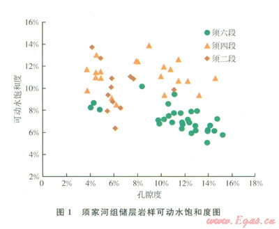 1)廣安須六段儲層可動(dòng)水飽和度最低,須四段儲層可動(dòng)水飽和度最高,須二段儲層可動(dòng)水飽和度介于兩者之間。