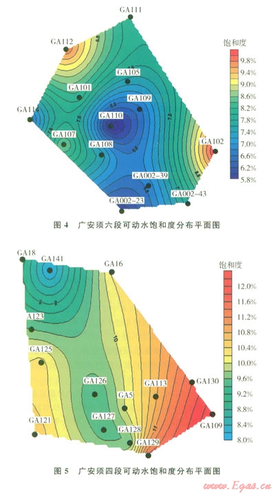 繪制了廣安氣田兩個(gè)主力區(qū)塊須家河組儲層可動(dòng)水飽和度平面分布圖,包括廣安2井區(qū)須六段120 km2和廣安106井區(qū)須四段400 km2儲層。