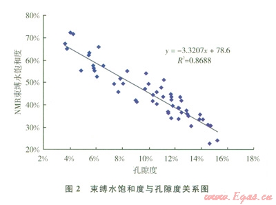 常規(guī)測井解釋可動(dòng)水飽和度的原理如下:根據(jù)核磁共振技術(shù)標(biāo)定巖樣束縛水飽和度(原始含水飽和度減去可動(dòng)水飽和度)與孔隙度之間的關(guān)系(2);②在各個(gè)深度點(diǎn),根據(jù)常規(guī)測井解釋出的孔隙度計(jì)算出束縛水飽和度;③將常規(guī)測井解釋出的原始含水飽和度減去束縛水飽和度,得到該深度儲層的可動(dòng)水飽和度,從而繪制出可動(dòng)水飽和度縱向分布曲線。