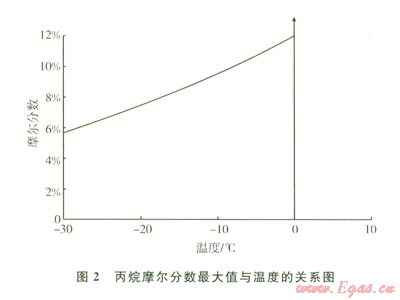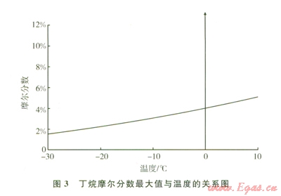 根據(jù)壓縮天然氣汽車燃料推薦做法”(SAEJ1616-1994)的規(guī)定,新版ISO 15403-1-2006推薦在可能達(dá)到的最低環(huán)境溫度和最高操作(或儲存)壓力下,CNG中冷凝液態(tài)烴的總量應(yīng)不超過1(摩爾分?jǐn)?shù))。壓力在6 00010 000 kPa范圍內(nèi)要求冷凝液態(tài)烴總量不超過l%時,不同溫度下CNG中相應(yīng)的最大丙烷和丁烷含量分別如圖23所示。