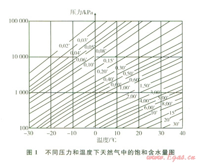 同時,在新版ISOTR l5403-2-2006的附錄E中列出了如圖l所示的不同壓力和溫度下天然氣中的飽和含水量,此圖是根據(jù)“天然氣水含量與水露點之間的關(guān)聯(lián)”(GBT 22634-2008、ISO 18453-2004)制作的。圖1表明:天然氣中含水量小于30 mgm3時,在25 MPa高壓下,其水露點低于-l3℃。這對于中國大部分地區(qū)均適用。