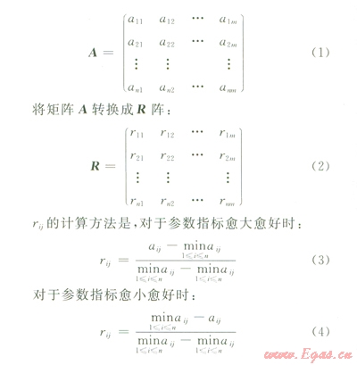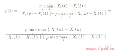 式中ρ為分辨系數(shù),ρ越小表示分辨率越大,ρ的取值區(qū)間為[01],一般取05;為所有比較序列各個指標(biāo)絕對差的最小值;為所有比較序列各個指標(biāo)絕對差的最大值;| X0 (k)- Xi(k)|為第i個序列第k個指標(biāo)與參考序列絕對差值。