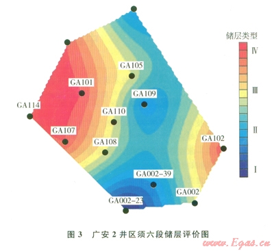 2)廣安2井區(qū)須六段儲層中部南北向為氣藏富集區(qū),東、西兩翼儲層為Ⅲ、Ⅳ類儲層。廣安106井區(qū)須四段儲層整體為Ⅲ、Ⅳ類儲層,西北翼和南部儲層相對較好。