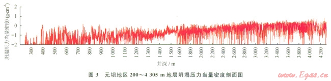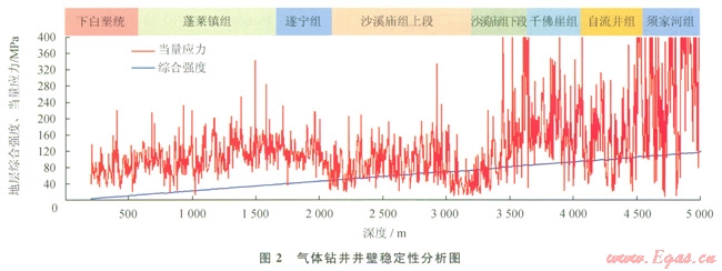 根據(jù)井壁穩(wěn)定性分析結(jié)果,深度小于2800m的地層當(dāng)量應(yīng)力低于地層巖石的綜合強(qiáng)度,氣體鉆井井壁穩(wěn)定性較好如圖2,而深度超過2800m的地層坍塌密度高于空氣鉆井臨界坍塌壓力當(dāng)量密度值(3),這些層段‘營氣鉆井過程中存在垮塌掉塊,可通過優(yōu)化鉆井參數(shù)來克服,并做好氣液轉(zhuǎn)換準(zhǔn)備;千佛崖組—須家河組地層氣體鉆井穩(wěn)定性較差,YB3井在自流井組3727.83791.5m應(yīng)用氮?dú)忏@井,僅進(jìn)尺63.7m,不但后期通井循環(huán)時間較長,鉆井費(fèi)用也有所增加,在目前技術(shù)條件下該井段采用氣體鉆井還存在一定難度。