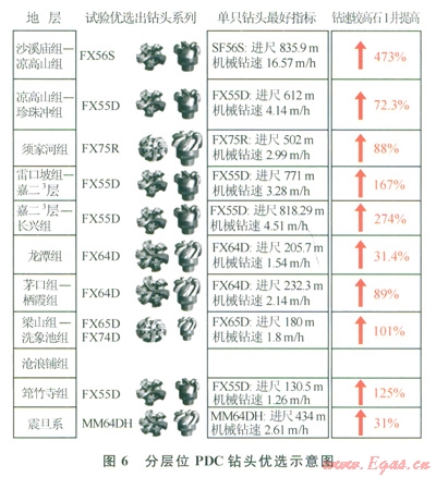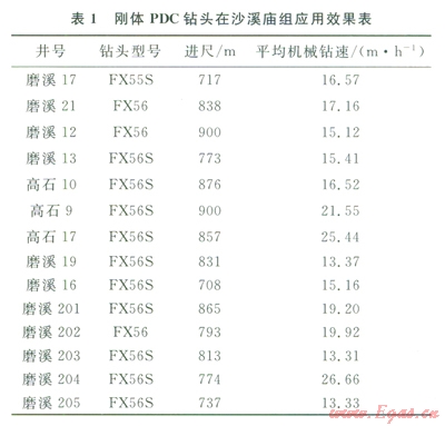 通過試驗與優(yōu)化改進PDC鉆頭,逐步優(yōu)選出適應各層位的PDC鉆頭型號(6),機械鉆速和單只鉆頭進尺大幅度提高,第二批正鉆井在沙溪廟地層試驗剛體PDC鉆頭取得新進展,平均機械鉆速由傳統(tǒng)胎體PDC鉆頭7.24mh提高到16.27mh(1),已接近空氣鉆進效果。