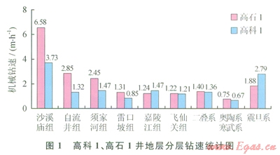 海相地層占全井進尺的57(3000m),巖石強度高,硅質(zhì)含量重,部分層段含燧石結核和角礫云巖,機械鉆速極低,高科1井、高石l井各地層平均機械鉆速統(tǒng)計如圖1所示,不能采用氣體鉆提速的陸相碎屑巖地層的平均機械鉆速小于2.50mh,嚴重影響了全井鉆井速度。