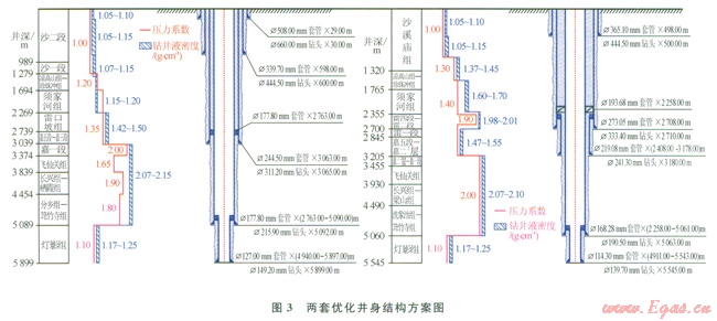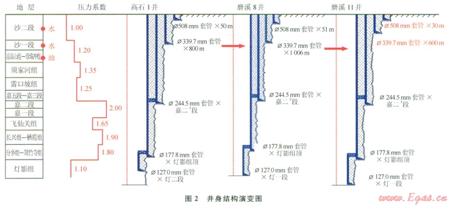 第二輪井的井身結構設計以地層3個壓力剖面為依據(jù),在充分分析地質(zhì)條件后,對Æ339.7mm表層套管下深進行了合理調(diào)整至500600m(2中的磨溪11),縮短了Æ444.5mm井眼段進尺300500m,確保Æ311.2mm井眼在鉆遇氣層后具備一定的井控能力,實施后的施工周期同比節(jié)約了67d。