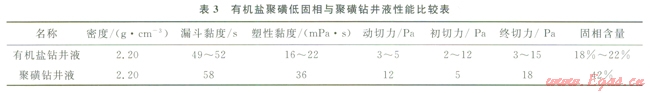 3為有機鹽聚磺低同相與聚磺鉆井液性能比較數(shù)據(jù),采用有機鹽加重劑配制的有機鹽聚磺低固相鉆井液,與單獨采用重晶石加重配制的聚磺鉆井液配相比,其流變性更好,固相含量更低,有利于改善鉆頭研磨巖石的井底工作環(huán)境,提高機械鉆速。