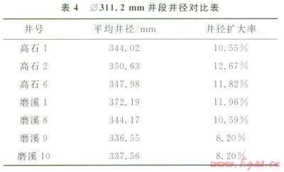 有機鹽鉆井液體系在高石2井、高石6井、磨溪8井、磨溪9井、磨溪l0井的Æ311.2mm井段和Æ215.9mm井段現(xiàn)場應用。表4為高石2、高石6、磨溪8、磨溪9、磨溪l0Æ311.2mm井段應用有機鹽鉆井液的平均井徑對比數(shù)據(jù),轉換為有機鹽體系后的滾動回收率均提高,機械鉆速明顯提高,平均井徑擴大率明顯降低(4),高石2井等井由于上部氣體鉆形成的大井徑,造成井徑擴大率偏高。