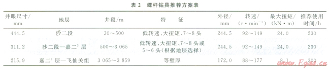 鉆井提速技術已經(jīng)廣泛應用PDC鉆頭+螺桿鉆具的復合鉆井模式[2],螺桿的使用增加了井底鉆頭轉速從而大幅提高鉆井速度。但常規(guī)螺桿鉆具在大尺寸井段的扭矩不足,隨著井底溫度升高也會對螺桿定子橡膠產(chǎn)生影響[5-6],通過對不同井眼尺寸的螺桿鉆具應用試驗效果進行分析,推薦了螺桿鉆具應用的參數(shù)要求(2),從而更好地與PDC鉆頭使用時間匹配: