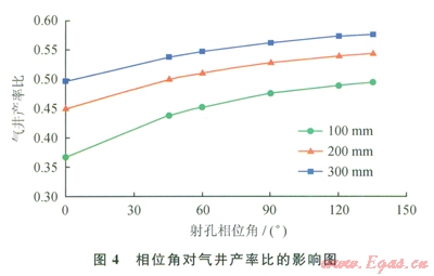 模擬研究認(rèn)為孔密超過(guò)l6孔/m時(shí),氣井產(chǎn)能增加幅度有限;相位角對(duì)產(chǎn)能的影響很明硅,作為酸壓(化)井,60°和l20°相位角比較合適,120°產(chǎn)能最高(圖4);產(chǎn)能隨孔眼深度的增加而增加,當(dāng)孔深增加到一定程度時(shí),氣井產(chǎn)能增加的幅度明顯變緩;氣井產(chǎn)能對(duì)孔徑十分敏感,產(chǎn)能隨孔徑增大增加明顯,在孔眼穿透污染帶以后這種影響更為顯著。