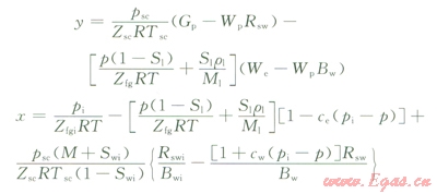 注意到x和y均為壓力的函數(shù),不同壓力下的數(shù)據(jù)點在y—x坐標(biāo)圖中應(yīng)位于同一直線上,直線的斜率即原始烴類孔隙體積。計算過程中可采用試算法確定部分未知項。包含自由氣與水溶氣的總儲量為: