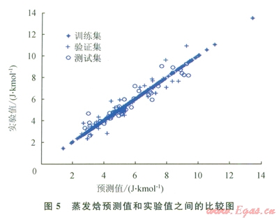化合物的數(shù)目表明了方程式數(shù)目,而分子描述符的數(shù)目則表明了系數(shù)數(shù)目。因此,化合物數(shù)目超出分子描述符數(shù)目的比率越小,ANN就能在訓(xùn)練集中表現(xiàn)得越好。不過,對不在“訓(xùn)練”集內(nèi)的化合物來說,以這種方法構(gòu)建的ANN無法保證其預(yù)測水平。舉例來說(如表l所示),對于所構(gòu)建的蒸發(fā)焓或燃燒焓模型而言,“測試”集的平均相對誤差遠(yuǎn)遠(yuǎn)大于“訓(xùn)練”集的平均相對誤差。解決此問題的一個(gè)可能方案是采用PCA[8]:用PCA來處理描述符,然后找到得分,取前30列的得分(含上述信息99%的內(nèi)容),最后按照上述步驟構(gòu)建一個(gè)新的ANN