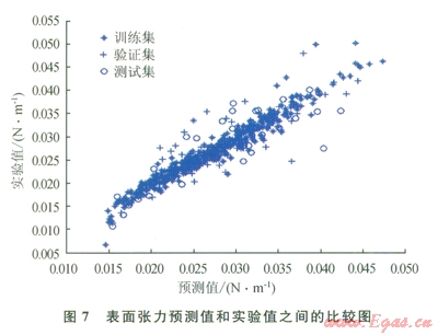 仔細(xì)研究所獲結(jié)果,可以發(fā)現(xiàn)訓(xùn)練集的相對誤差總是小于“驗(yàn)證”集或“測試”集的相對誤差,這主要是因?yàn)?ldquo;驗(yàn)證”集或“測試”集對ANN的訓(xùn)練方式?jīng)]有直接影響。因此,對人工神經(jīng)網(wǎng)絡(luò)進(jìn)行了修正,使其更適合于“訓(xùn)練”集的數(shù)據(jù)??梢园延?xùn)練過程想象為找出方程組的待定系數(shù)。