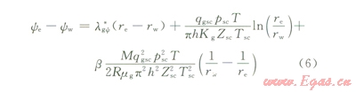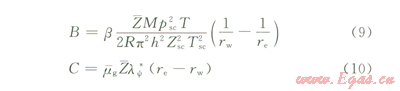 Kg為氣相滲透率,mD;Kw為水相滲透率,mD;lg為氣相啟動壓力梯度,atm/cm(1atm=98.0665kPa);lw為水相啟動壓力梯度,atm/cm;lgy,為原始狀態(tài)下的氣相啟動擬壓力梯度,atm2/(mPa·s·cm);rw 為井筒半徑,cm;re為氣井控制半徑,cm;mg為氣體的黏度,mPa·s;mw為地層水的黏度,mPa·s;`mg平均地層壓力下氣體的平均黏度,mPa·s;qwsc為標況下產(chǎn)水量,cm3;qgsc為標準狀況下產(chǎn)氣量,cm3/S;h為氣層厚度,cm;b為描述孔隙介質(zhì)紊流影響的系數(shù),稱為速度系數(shù),cm-l;rg為氣體密度,g/cm3;rw為地層水密度,g/cm3;qgAOF為天然氣無阻流量,cm3/s;Pi為原始地層壓力,arm;Pe為某時刻地層壓力,atm;Pwf為井底壓力,atm;Psc為地面標準狀況下壓力,atm;ye為某時刻地層擬壓力,atm2/(mPa·s);ywf為井底擬壓力,atm2/(mPa·s);G為氣井控制儲量,cm3;Gp為氣井累計產(chǎn)氣量cm3;Zi為原始條件下氣體壓縮因子;`Z為平均地層壓力下氣體的壓縮因子;Zsc為地面標準狀況下氣體的壓縮因子;T為氣層溫度,K;R為氣體常數(shù),82.053atm·cm3/(mol·K);We為累計水侵量,cm3;Wp為累計產(chǎn)水量,cm3;Bg為氣相體積系數(shù);Bw為水相體積系數(shù)。