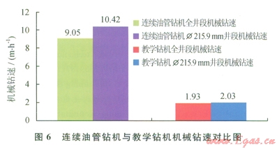 2)連續(xù)油管的Æ215.9mm井眼段鉆進,進尺為285.74m,純鉆時間為27.40h,機械鉆速為l0.42m/h。而采用宏華2號教學(xué)鉆機鉆的Æ215.9mm井眼段平均機械鉆速僅為2.03m/h。因此在Æ215.9mm井眼的鉆進中,連續(xù)油管鉆機的機械鉆速是教學(xué)鉆機機械鉆速的5.1倍(圖6)。