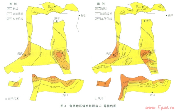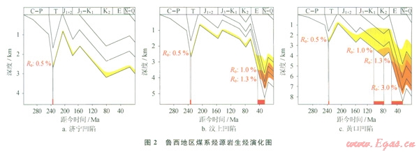 2)各凹陷烴源巖的熱演化過程有3種類型:濟寧、巨野凹陷為印支期一次生烴型,生烴能力極差,對該區(qū)煤成氣成藏貢獻不大;汶上凹陷為印支一喜馬拉雅山期二次生烴型,但僅局部達到二次生烴條件,生烴潛力有限;黃口、成武、魚臺等凹陷為印支一燕山期、喜馬拉雅山期二次生烴型,烴源巖大面積成熟,生烴潛力最大。