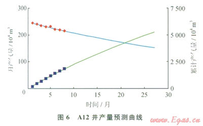多數(shù)單井遞減率接近20%,l4口單井產(chǎn)量遞減類型符合指數(shù)遞減,6口單井產(chǎn)量遞減類型符合調(diào)和遞減。如Al2井,初始產(chǎn)量為249.0577×104m3,初始遞減率為0.0184,年遞減率19.83%(圖5、6),產(chǎn)能遞減方程為: