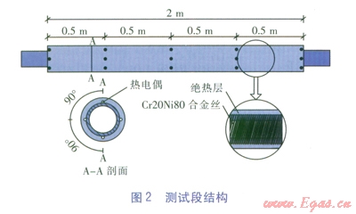 測(cè)試段為有效加熱長(zhǎng)度為2m的半硬態(tài)水平光滑銅管(見圖2),內(nèi)直徑為4mm,外直徑為6mm,在測(cè)試段進(jìn)口、出口分別安裝壓力、溫度傳感器。在測(cè)試段每隔0.5m安裝熱電偶,以測(cè)量銅管外壁溫度,熱電偶用絕緣膠布固定在銅管外壁。電加熱絲采用直徑為045mmCr20Ni80合金絲,總電阻為82.5Ω,用于模擬蒸發(fā)器負(fù)荷。最外層設(shè)置絕熱層,起到固定和絕熱作用。電加熱絲與調(diào)壓器相連接,通過調(diào)節(jié)直流電壓來調(diào)節(jié)電加熱功率,改變測(cè)試段熱流密度。測(cè)試段熱流密度q的計(jì)算式為: