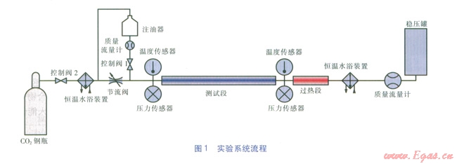 為了測(cè)試C0:一PAG油混合物(以下簡(jiǎn)稱混合物)水平光滑管內(nèi)流動(dòng)沸騰換熱特性,筆者設(shè)計(jì)搭建了實(shí)驗(yàn)臺(tái)(見圖l)。實(shí)驗(yàn)臺(tái)采用開式系統(tǒng),C02從鋼瓶中流出進(jìn)入恒溫水浴裝置進(jìn)行溫度調(diào)節(jié)和控制,模擬C02制冷系統(tǒng)中氣體冷卻器出口狀態(tài)。通過節(jié)流閥對(duì)C02進(jìn)行流量控制,并使節(jié)流閥出口處的C02以液霧形式出現(xiàn)。在節(jié)流閥出口設(shè)置注油器,通過管道連接節(jié)流閥入口和出口,產(chǎn)生壓差,連同重力作用,注油器內(nèi)的潤(rùn)滑油可連續(xù)注入節(jié)流閥出口管內(nèi),并與C02充分混合。注油器出口安裝流量計(jì),以測(cè)量潤(rùn)滑油注入流量,控制閥1可調(diào)節(jié)PAG油注人流量。然后混合物進(jìn)入測(cè)試段(模擬蒸發(fā)器)。為準(zhǔn)確控制并測(cè)量C02的質(zhì)流密度(C02質(zhì)量流量與管內(nèi)截面積之比),在鋼瓶出口設(shè)置控制閥2(用于控制C02質(zhì)量流量),在測(cè)試段出口設(shè)置過熱段與恒溫水浴裝置(使C02完全氣化)及質(zhì)量流量計(jì)。
