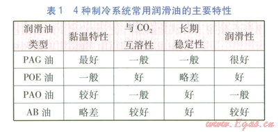 目前,制冷系統(tǒng)常用的潤(rùn)滑油包括PAG(聚亞烴基乙二醇油)POE(脂類油)、PAO(α-聚烴油)、AB(烷基苯類油)[11],主要特性見表1。