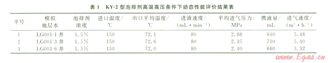 使用PP-1型高溫高壓泡沫評(píng)價(jià)裝置測(cè)定高溫高壓條件下KY-2泡排劑動(dòng)態(tài)性能,其測(cè)試結(jié)果見(jiàn)表1。實(shí)驗(yàn)數(shù)據(jù)表明在進(jìn)口溫度150℃和恒定進(jìn)液速度(80mLmin),控制進(jìn)氣速度(5.225.48 m3h)的條件下,KY-2型泡排劑的攜液量仍然超過(guò)600 mL,說(shuō)明KY-2型泡排劑在高溫高壓下的動(dòng)態(tài)性能較好。