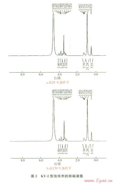 根據(jù)深井高溫有水氣藏的實(shí)際情況和泡排劑的研制原則,研制了KY-2型耐高溫泡排劑,在按照SYT6465-2000標(biāo)準(zhǔn)進(jìn)行常規(guī)性能評(píng)價(jià)的基礎(chǔ)上,利用所建立的實(shí)驗(yàn)方法,泡排劑在常溫和170℃老化24 h后進(jìn)行了分子量、聚集數(shù)、紅外和核磁圖譜分析(1、2)。泡排劑在常溫和l70℃下的分子量分別為5 6215 614,聚集數(shù)分別為292.861 0292.979 4。實(shí)驗(yàn)表明,KY-2型泡排劑在老化前后的分子量和聚集數(shù)基本一致,可以確定該泡排劑在老化前后沒(méi)有發(fā)生分子鏈斷裂、纏繞。
