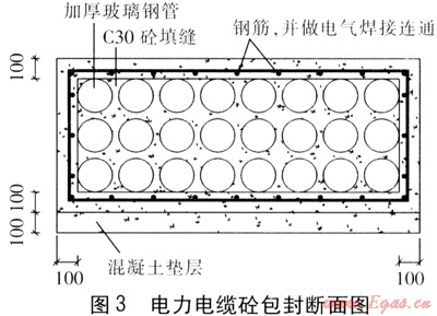 我們將電纜溝與輸氣管道交叉點(diǎn)兩側(cè)各10m以內(nèi)部分改為埋管(電纜在套管內(nèi)穿過(guò))敷設(shè),套管采用加厚玻璃鋼管并用鋼筋混凝土包封(現(xiàn)澆施工),并對(duì)鋼筋網(wǎng)作電氣焊接連通,見(jiàn)圖3。通信管道原設(shè)計(jì)就采用埋管形式,故只在交叉位置前后各10m采用與電力電纜相同的鋼筋混凝土包封,并對(duì)鋼筋網(wǎng)作電氣焊接連通。