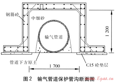 A號(hào)路為城市快速路,建設(shè)標(biāo)準(zhǔn)高,路面結(jié)構(gòu)厚度約80cm,路基需要分層碾壓以滿足道路密實(shí)度要求??紤]到輸氣管道設(shè)計(jì)壓力高,環(huán)向應(yīng)力大,為保證管道在道路施工及今后運(yùn)行中的安全,我們對(duì)A號(hào)路車行道下的輸氣管道采用管溝保護(hù)(見(jiàn)圖2,圖中尺寸單位為mm,以下同)。管溝內(nèi)壁與輸氣管道之間凈距不小于50cm,采用現(xiàn)澆施工,兩端伸出道路邊緣2m,并要求施工中盡量保留輸氣管道周圍的原土,避免破壞管道防腐層。