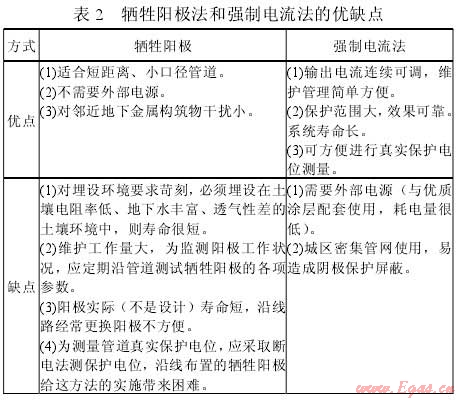 陰極保護(hù)可采用犧牲陽極法和強(qiáng)制電流法,兩種方法性能比較如表2