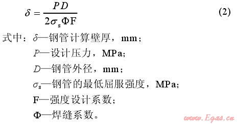 管道壁厚選取不僅要求滿足管道強(qiáng)度、穩(wěn)定性要求,同時應(yīng)滿足抗御外力破壞的要求。按照《城鎮(zhèn)燃?xì)庠O(shè)計(jì)規(guī)范》(GB500282006)的相關(guān)要求,直管段管壁厚度按公式(2)計(jì)算: