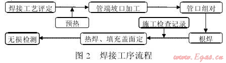 常用焊接方法有:手工電弧焊、埋弧自動焊、氬弧焊、CO2氣體保護(hù)焊、等離子弧焊、電渣焊。高壓、次高壓管道主要采用的焊接方法:焊條電弧焊上向焊(手工焊)、焊條電弧焊下向焊(手工焊)、自動保護(hù)藥芯焊絲電弧焊下向焊(半自動焊)、熔化極氣體保護(hù)電弧焊下向焊(半自動焊、機(jī)械化焊接),其焊接工序流程見圖2