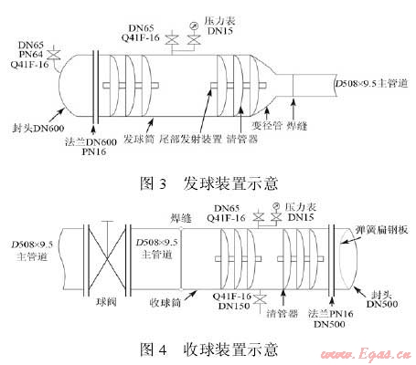 管道清掃干凈后進(jìn)行注水試壓,水壓試壓每段不宜超過35km,高差不宜超過30m,管道試壓注水時,宜加隔離球,且應(yīng)保持一定的球前壓力,以排除管內(nèi)空氣,試壓合格后排盡試壓水并對管道進(jìn)行干燥,直至管內(nèi)空氣水露點(diǎn)比輸送條件下最低環(huán)境溫度低5℃,若管道封閉超過3個月未投產(chǎn),應(yīng)對管道進(jìn)行充氮?dú)獗Wo(hù)。下面以主管道D508×9.5為例,其發(fā)球裝置和收球裝置示意圖如下: