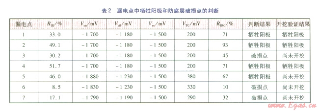 如果RIRC大于等于0.6,則可判斷此處金屬表面防腐層的電阻很小,預(yù)測(cè)為犧牲陽(yáng)極;如果RIRC>1,則不排除此處管道上伴隨有防腐層破損情況;如果RIRC小于0.6,則表明此處金屬表面防腐層的絕緣電阻還比較大,可以判斷為防腐層破損。此處的0.6是一個(gè)經(jīng)驗(yàn)性數(shù)值,按此判斷是否精準(zhǔn),還需要更多的實(shí)踐來(lái)證實(shí)。根據(jù)此方法,對(duì)7處漏電點(diǎn)的判斷結(jié)果見(jiàn)表2。