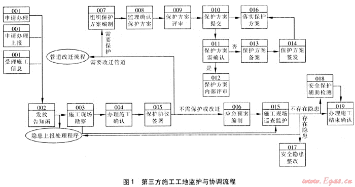深圳市燃氣集團股份有限公司依據(jù)《深圳市燃氣管道設施保護辦法》相關(guān)要求,針對第三方施工作業(yè)對燃氣管道設施的危害特點,建立對第三方施工工地的巡查監(jiān)護和管道設施保護協(xié)調(diào)程序,對第三方施工時燃氣管道設施保護監(jiān)管過程實施程序化、標準化的控制管理。通過對第三方施工作業(yè)監(jiān)管過程的規(guī)范化控制,明確相關(guān)角色職責,設置管道設施保護關(guān)鍵控制點。第三方施工工地監(jiān)護與協(xié)調(diào)流程見圖1。