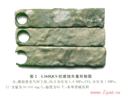 室內(nèi)模擬試驗表明L360QCS低合金管材在普光氣田高含硫工況下的腐蝕速率較高,特別是有單質(zhì)硫沉積以后,將出現(xiàn)極高的腐蝕失重?,F(xiàn)場監(jiān)測、檢測表明集氣站內(nèi)管道盡管有單質(zhì)硫沉積,但通過定期清管清除單質(zhì)硫及腐蝕產(chǎn)物、同時實施預(yù)涂膜+連續(xù)緩蝕劑加注等防腐措施,將均勻腐蝕速率控制在0.076mm/a,服役后開管檢查管內(nèi)壁幾乎沒有腐蝕,智能清管也只檢測到有個別局部腐蝕,表明緩蝕劑添加對管線起到了很好的保護(hù)作用。
